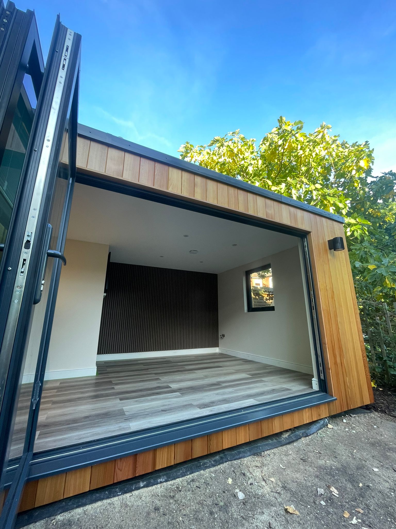 A garden room featuring bespoke wall, custom cabinetry, bifold doors, media and green roof.